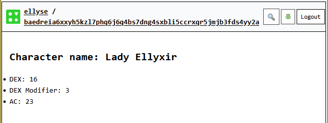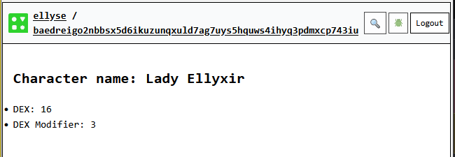 If all we want to do is display the derived calculation, we can simply put it between the {} symbols. Let’s display our dexterity modifier. We’ll use this later to calculate our Armor Class.